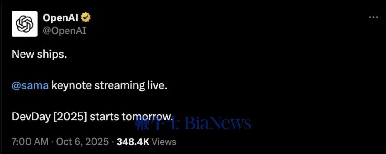 短短两句话,瞬间引爆了AI开发圈。紧接着,OpenAI官方账号转发确认:“新船启航。Altman主题演讲将全程直播。开发者大会明天正式开幕。”