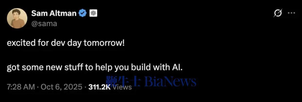 Altman写道:“为明天的开发者大会感到兴奋!有一些新东西,可以帮你用AI进行构建。”